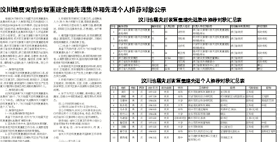 汶川地震灾后恢复重建全国先进集体和先进个人推荐对象公示