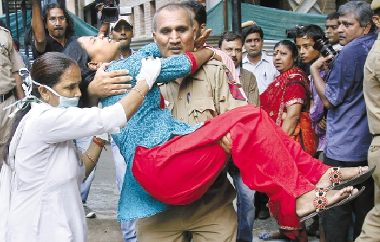 9月7日,印度首都新德里高等法院门口发生爆炸后,警察和护士运送一名伤员离开现场。 新华社发