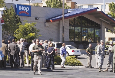 9月6日,在美国内华达州卡森城,执法人员和国民警卫队成员站在枪击现场。 新华社发