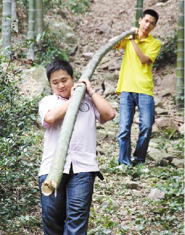 记者陈栋和金梁一起将砍下的竹子扛下山。 陈旭辉 段涵 摄