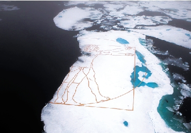 这张近日由绿色和平组织提供的照片显示,绿色和平组织破冰船“极地曙光号”的成员帮助艺术家约翰·奎格利在北极海冰上完成的艺术作品——残缺的达芬奇名作“维特鲁威人”。绿色和平组织希望借此作品提醒人们北极冰川和海冰正在融化,针对气候变化问题应在全球范围内采取紧急行动。 新华社发