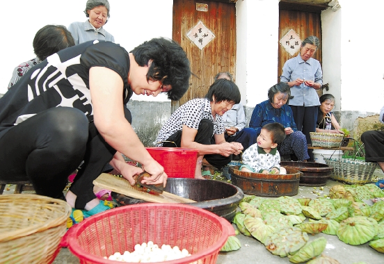 武义县柳城畲族镇祝村,村民围坐在一起剥当地特产宣莲。 记者 徐彦 摄