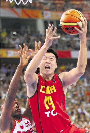 9月15日,中国队球员王治郅(右)在比赛中上篮。 新华社发