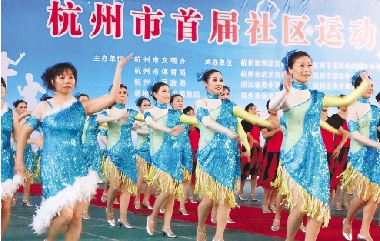 9月15日,绚丽多姿的排舞赛拉开了杭州市首届社区运动会的序幕。近百社区的2000多名市民参赛,全部赛事将于本月24日结束。 东东 摄