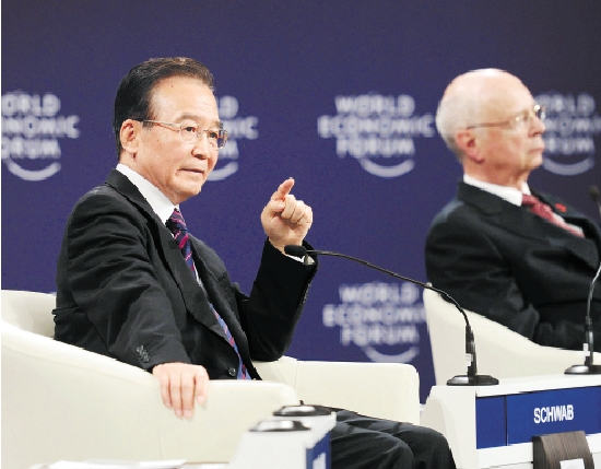9月14日,国务院总理温家宝在大连与出席第五届夏季达沃斯论坛的企业家座谈。 新华社记者 马占成 摄