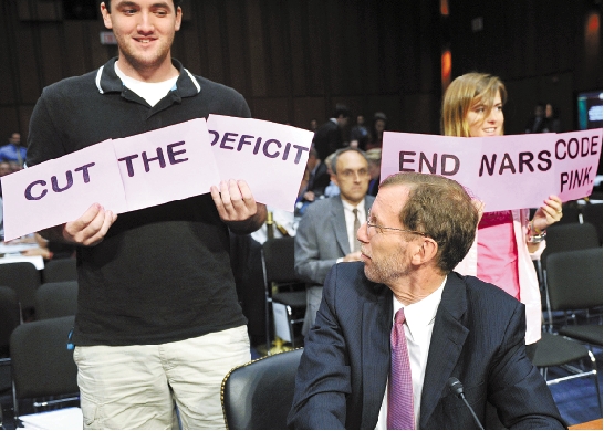 9月13日,在美国首都华盛顿国会山,美国会预算局局长道格拉斯·埃尔门多夫(前)出席听证会时,抗议者手举“减赤”标语。当天,由美国民主党和共和党议员组成的减赤特别委员会召开了成立以来的第一次听证会,多位委员会成员强调要通过“开源”和“节流”并举的途径来解决美国面临的根本性和长期性债务挑战。 新华社记者 张军 摄