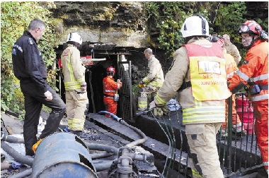 英国南威尔士地区格莱申煤矿15日发生透水事故,目前3名矿工获救,1名矿工死亡,还有3名矿工被困。图为救援人员在南威尔士基勒贝比尔附近的格莱申煤矿入口处工作。 新华社发
