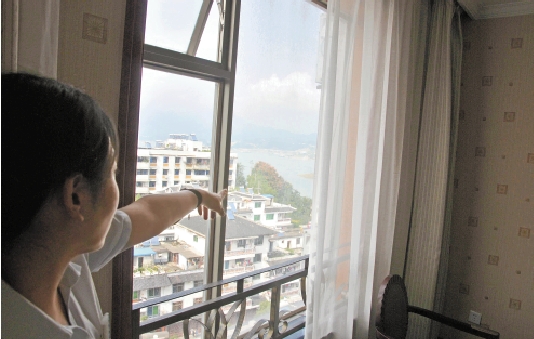 秭归县“豪庭酒店”的一名服务员望向窗外的三峡大坝风景(9月15日摄)。这是一家三星级酒店,多位前台服务员告诉记者,今年4-5月间,县委办公室曾订下酒店8楼和9楼两层楼,约40间房间,多为标准间,平均每间房协议价约为200元。据酒店一位姓陈的负责人介绍,巡视组实际只用了8楼的房间。 新华社记者 冯国栋 摄
