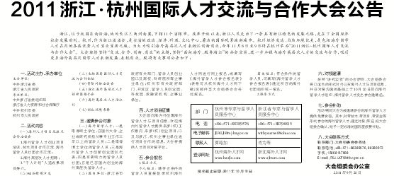 浙江,位于我国东南沿海,地处长江三角洲南翼,下辖11个省辖市。改革开放以来,浙江人民走出了一条具有浙江特色的发展之路,走在了全国经济社会发展前列。杭州,作为浙江省省会,是全省的政治、经济、科教、文化中心,著名的国际风景旅游城市。杭州经济发达、自然环境优美,是包括海外留学人才在内的各类优秀人才宜业宜居之城。为大力吸引海外高层次人才来浙江创新创业,今年11月8日至9日将在杭州举办“2011浙江·杭州国际人才交流与合作大会”。大会继续坚持“交流、合作、创新、创业”的主题,坚持“面向海外、服务浙江”的办会宗旨,进一步加强与海外高层次人才的交流与合作,吸引更多海外高层次留学人才来浙发展、来杭创业。现将有关事项公告如下: