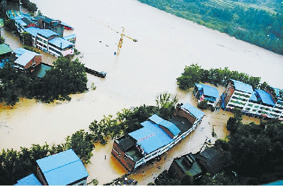 9月18日,巴河洪水漫过四川省巴中市平昌县城,远处工地的塔吊也被拦腰淹过。 新华社发