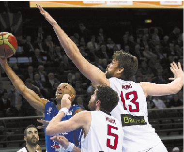西班牙队球员马克·加索尔(右)、费尔南德斯(中)防守法国队球员帕克。