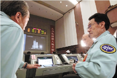 图为天宫一号发射前,中国载人航天工程首任总设计师、中国工程院院士王永志(右一)在北京航天飞行控制中心。 新华社记者 刘卫兵 摄