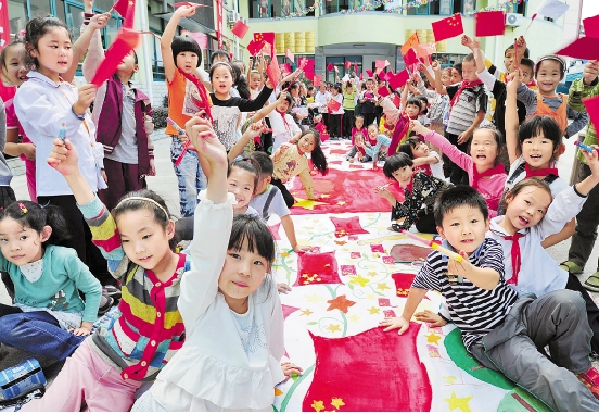 | 图为昨天上午,宁波江东区朱雀小学学生在操场画巨幅国旗,庆祝国庆节。 记者 吴晓鹏 通讯员 徐佳伟 周琦娜 摄 |