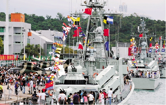 10月1日,香港市民在参观军舰。当日,中国人民解放军驻香港部队在昂船洲军营举行了“军营开放日”活动。驻军官兵的军乐列队表演以及拳术、枪械团体操、猎人战斗等精彩而又富有军事特色的表演,博得现场阵阵喝彩,吸引了约15000名香港市民前往参观。 新华社发 |