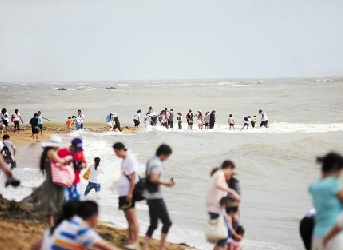 10月2日,游客在海南琼海万泉河入海口观光戏浪。受今年第19号台风“尼格”影响,当日上午,海南博鳌海滨风力逐渐加大,海南气象台8时31分发布海上台风红色预警并启动全省热带气旋Ⅳ级应急响应。 新华社发