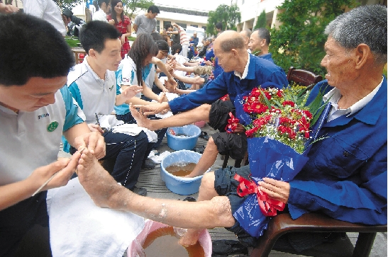 10月5日上午,台州市路桥区开展“重阳敬老爱老”活动,为老人洗脚,并将猪肉、荔枝、麦片等物品分别送到蓬街镇敬老院、蓬街老人乐园、新光村老年协会的老人手中。 王保初 摄