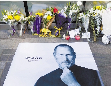 “因为有他,枯燥的世界有了鲜活。”10月6日,一些粉丝自发来到苹果北京三里屯专卖店门口,摆上打印的乔布斯的照片和鲜花表达对乔布斯离去的哀思。 新华社记者 罗晓光 摄