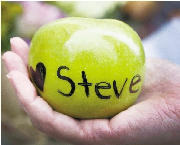 10月6日,在美国旧金山,一名女子手持写有乔布斯名字的苹果。