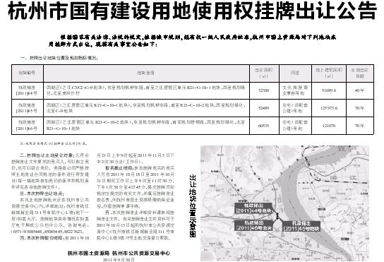五、本次挂牌出让详细资料请参阅挂牌出让文件。有关挂牌出让文件资料可于2011年10月13日起到杭州市公共资源交易中心(杭州市钱江新城新业路311号市民中心L楼3楼)7号土地交易窗口索取。