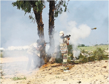 利比亚当局“全国过渡委员会”武装与穆阿迈尔·卡扎菲残部在卡扎菲老家苏尔特的激战进入最后关头。执政当局一名消息人士7日说,当局武装使用重型武器,从东西两个方向对苏尔特市中心发起猛攻,与卡扎菲残余势力在苏尔特市展开“巷战”。图为10月7日,执政当局武装人员在苏尔特市发起攻击。 新华社发 |