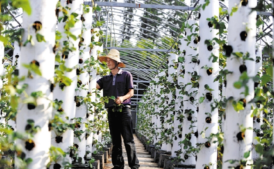 10月9日,余杭区南苑街道盛庄花卉有限公司基地里,利用PVC管立体栽培草莓,一根柱子种植28株草莓。立体栽培的产量是普通种植方法的3倍。