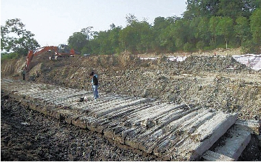 绍兴一个在建的高档别墅园工地里,挖到一座有2500年历史的古墓。图为古墓挖掘现场,宽4米,长40多米的古木依次排开,现场专家猜测这可能是古墓的墓底。 记者 江晨 摄
