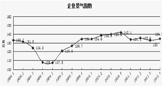 图为2008年来,我省企业景气指数(其中,2011年4季度为预计数)。