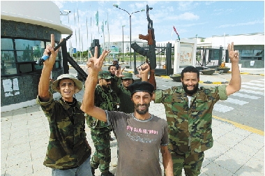 10月9日,在利比亚苏尔特,利执政当局武装士兵在控制瓦加杜古会议中心之后庆祝胜利。 新华社发