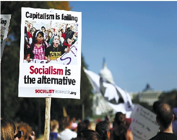 10月8日,在美国首都华盛顿国会山前,示威者高举标语牌。 新华社发