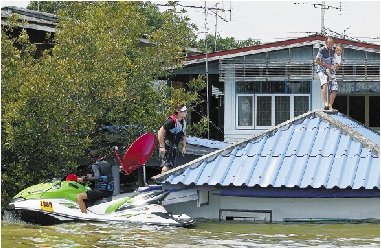 10月9日,在泰国大城府洪水灾区,一名怀抱孩童的男子站在被淹房屋的屋顶等待救援。 新华社发