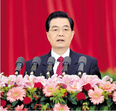 10月9日,纪念辛亥革命100周年大会在北京人民大会堂隆重举行。中共中央总书记、国家主席、中央军委主席胡锦涛在大会上发表重要讲话。 新华社发