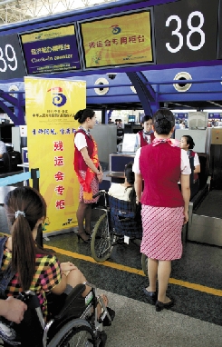 针对大型体育赛事、大批量残疾人运动员集中到达、离开的无障碍需求,杭州萧山国际机场贵宾室、无障碍通道、无障碍卫生间、无障碍摆渡车、低位柜台、电梯、标志标识等都进行了改造,新增了航站楼内无障碍摆渡车、移动式临时无障碍无性别卫生间等。对铁路杭州站、火车南站的无障碍通道、卫生间、扶手、低位柜台等进行了改造,更新了杭州火车站1号站台电梯。在杭州火车南站购置了4台电动阶梯升降机(无障碍爬楼车),解决了残疾人运动员进出站。