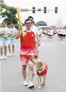 第16棒火炬手朱伟成说,组委会一开始拒绝了朱伟成的要求,但在他的一再坚持下,飞飞这个“火炬手”的身份才得到了批准。“我已经离不开飞飞了,他是我的眼睛,也是我生命中的一部分,更是我的助手,我是火炬手它也是火炬手。”