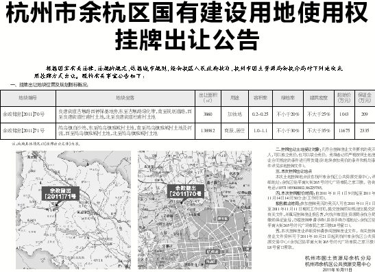 五、本次挂牌出让详细资料请参阅挂牌出让文件。有关挂牌出让文件资料可于2011年10月21日起到杭州市余杭区公共资源交易中心(余杭区临平南大街265号时代广场市民之家三楼)L8号窗口索取。