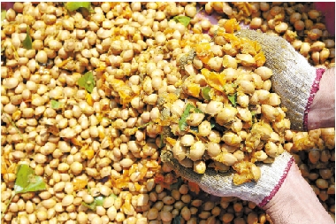近来,诸暨白果身价跌到每公斤10元,成了村民心中的痛。图为应店街镇灵山坞村民在清理捡来的白果,供自家食用。 郭斌 摄