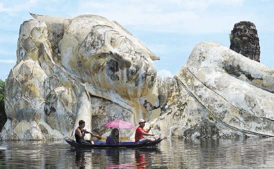 10月10日,在泰国大城府,受灾居民划船经过一尊卧佛雕像。泰国财政部长提拉猜10日说,持续两个多月的洪灾给泰国造成的损失预计达600亿泰铢(约合19.4亿美元),相当于国内生产总值的0.6%。 新华社发
