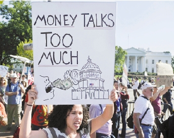 10月6日,“占领华盛顿”活动示威者手持写有“有钱能使鬼推磨”字样的标语。