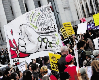 10月5日,人们在纽约曼哈顿的福利广场集会抗议。
