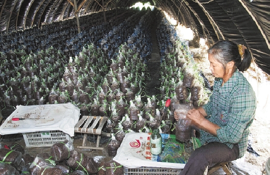10月11日,衢州市开化县华埠镇友谊村,59岁的村民余水妹在接种金针菇。她家已经种了20多年金针菇,去年种了60000袋金针菇,收入颇丰,今年打算种植更多的金针菇。