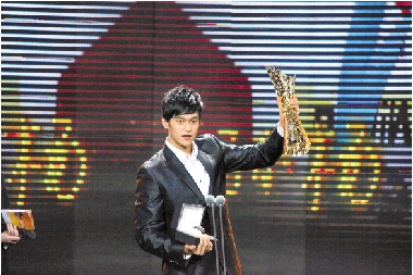 昨晚,第六届中国十佳劳伦斯冠军奖在象山县体育馆揭晓。林丹、李娜分获年度最佳男女运动员奖,孙杨荣获最佳新人奖和突破奖两项大奖。图为孙杨领取奖杯的情景。 记者 李建新 通讯员 丁华 陈光曙 摄