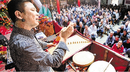 中国曲艺家协会近日授予瑞安市“中国曲艺之乡”称号。图为瑞安市城北村活动中心,一位琴师正在演唱温州鼓词,近千名村民慕名赶来聆听。 李震宇 孙凛 摄