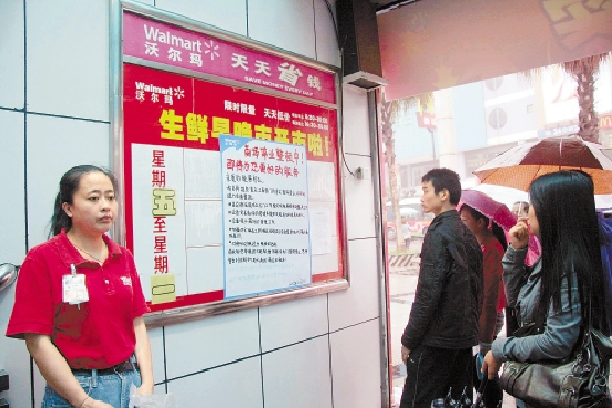 10月11日,重庆万州沃尔玛太白路分店超市门口,几位顾客在观看沃尔玛门店停业整顿的公告。 新华社发