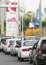 10月11日,在希腊雅典的一家加油站外,来加油的汽车排起长队。当日,雅典炼油厂的雇员们开始罢工以抗议政府的新紧缩措施。恐慌的民众纷纷驱车涌入加油站。