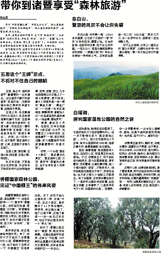 或许,诸暨在你的印象中,还只有“西施故里”、“五泄瀑布”这两大景点,再就是“珍珠”、“袜子”、“香榧”这三大旅游名品。我要说,那已是“老皇历”了。不说别的,仅仅是诸暨的森林旅游,就能让你大开眼界、大饱口福。