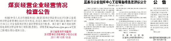 根据《中华人民共和国煤炭法》、国家《煤炭经营监管办法》和《浙江省煤炭经营监督管理办法》的有关规定,决定从2011年10月20日起至2011年12月31日止对全省煤炭经营企业经营情况进行检查。请企业于10月底前到所在地煤炭经营监管部门领取《检查表》。详情查询http://www.zjjxw.gov.cn/处室之窗/建冶煤办/通知公告。