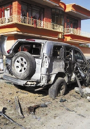 10月17日,在阿富汗法里亚布省首府迈马纳市,当地警察在自杀性爆炸袭击现场警戒。阿富汗国家安全局驻北部法里亚布省分支负责人17日遭遇自杀式袭击,包括这名负责人在内的6人受伤、两人丧生。袭击者当天早晨在迈马纳市一辆汽车旁引爆随身携带的爆炸物。 新华社发