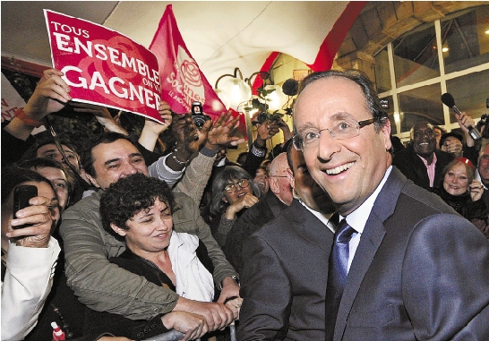 10月16日,法国社会党前总书记弗朗索瓦·奥朗德(右)抵达位于巴黎的该党总部。 新华社发