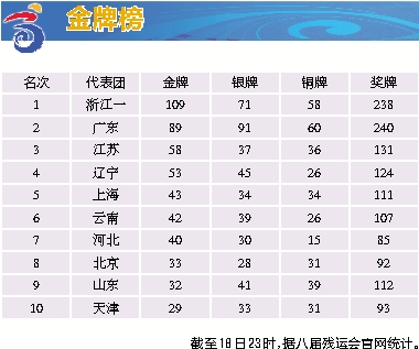 | 3 | 江苏 | 58 | 37 | 36 | 131 |