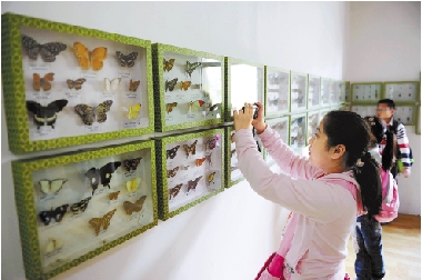 10月19日,40名杭州中小学生走进西溪湿地参与农耕渔事,了解湿地自然生态及环保科普知识。图为学生们参观湿地昆虫标本。
