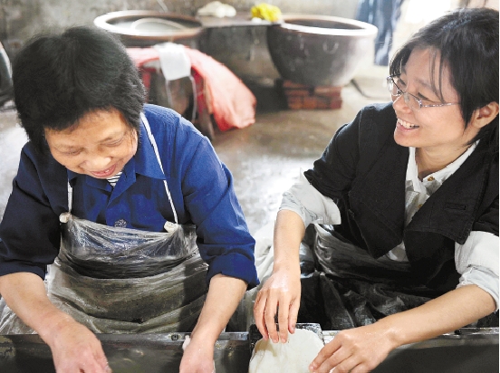 钱方定教记者剥蚕茧。倪晓伟 摄